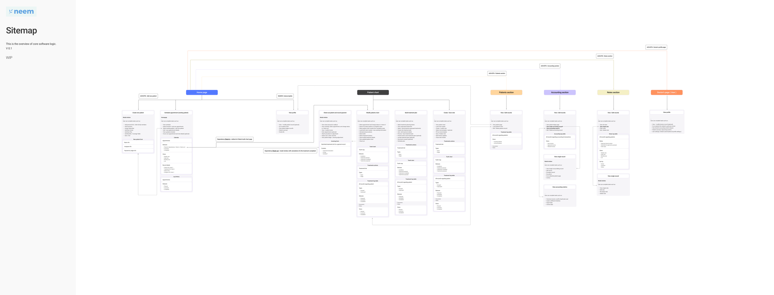 We have thoroughly researched all possible cases and scenarios to ensure they are covered comprehensively in a single, clear sitemap. This approach is designed to facilitate the development of a scalable and efficient system specifically tailored for dental companies.