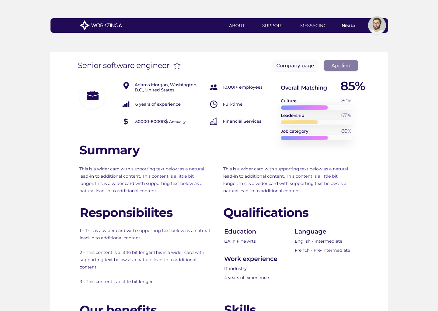 Clear and detailed description of a specific job is essential to emphasize the most important details about the role. This should include an integrated widget featuring the core functionality—Assessment Match Level—which helps to accurately gauge the suitability of candidates for the position.
